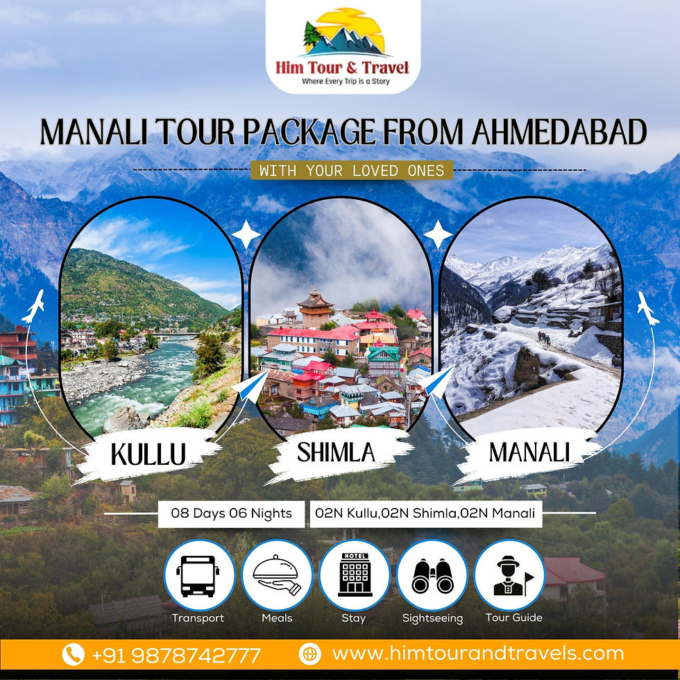 Affordable Manali Tour Package from Ahmedabad with Customised Itineraries makes it easier for travellers to enjoy a stress free mountain holiday that fits their budget and travel style. A well planned Manali Tour Package from Ahmedabad offers the perfect mix of snow adventures, peaceful sightseeing, and local experiences. From scenic valleys to lively markets, Manali creates memories that stay with you long after the trip ends. For travellers looking for reliable planning and comfortable travel arrangements, Him Tour and Travels offers thoughtfully designed packages to ensure a smooth and memorable Manali holiday.